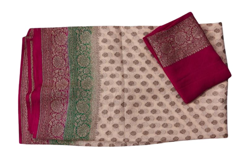 The Khaddi Georgette Silk Saree is a timeless handloom creation from Varanasi, woven with precision and passion by skilled artisans. Crafted in pure silk georgette, the fabric is known for its soft, flowy drape and subtle sheen, making it light yet luxurious.