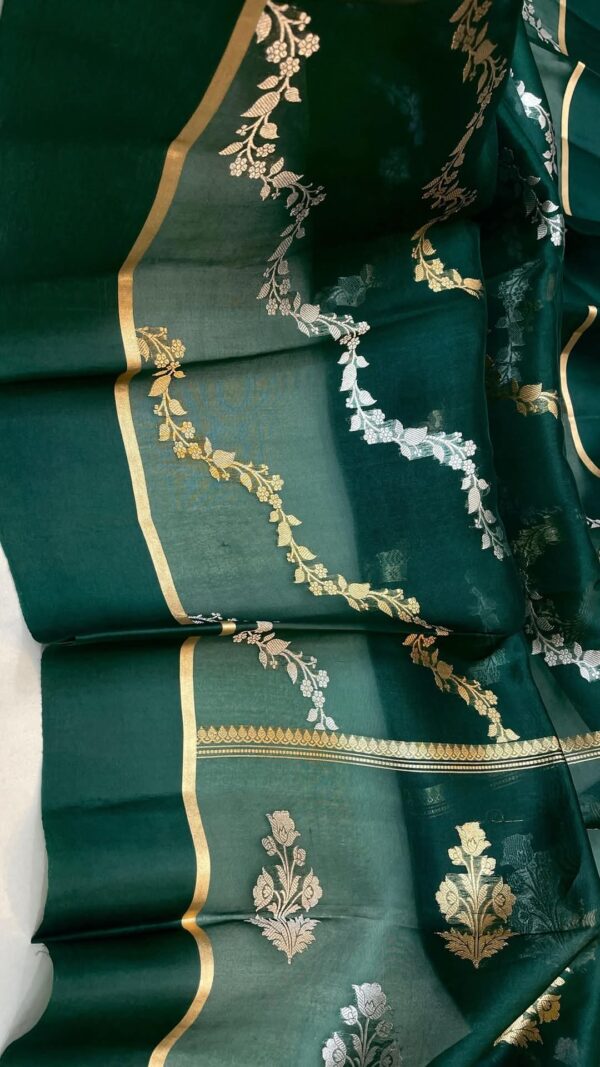 Light as a feather yet regal in presence, Pure Kora Silk Sarees are among Banaras’ most graceful creations. Woven from the finest handloom Kora (organza) silk, these sarees are admired for their sheer texture, natural stiffness, and unmatched elegance.