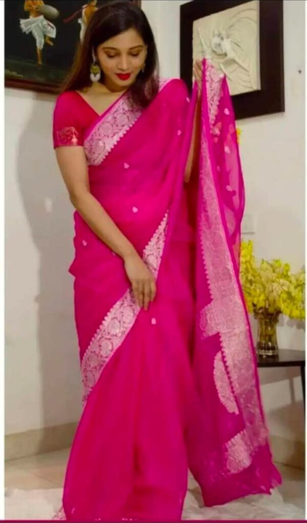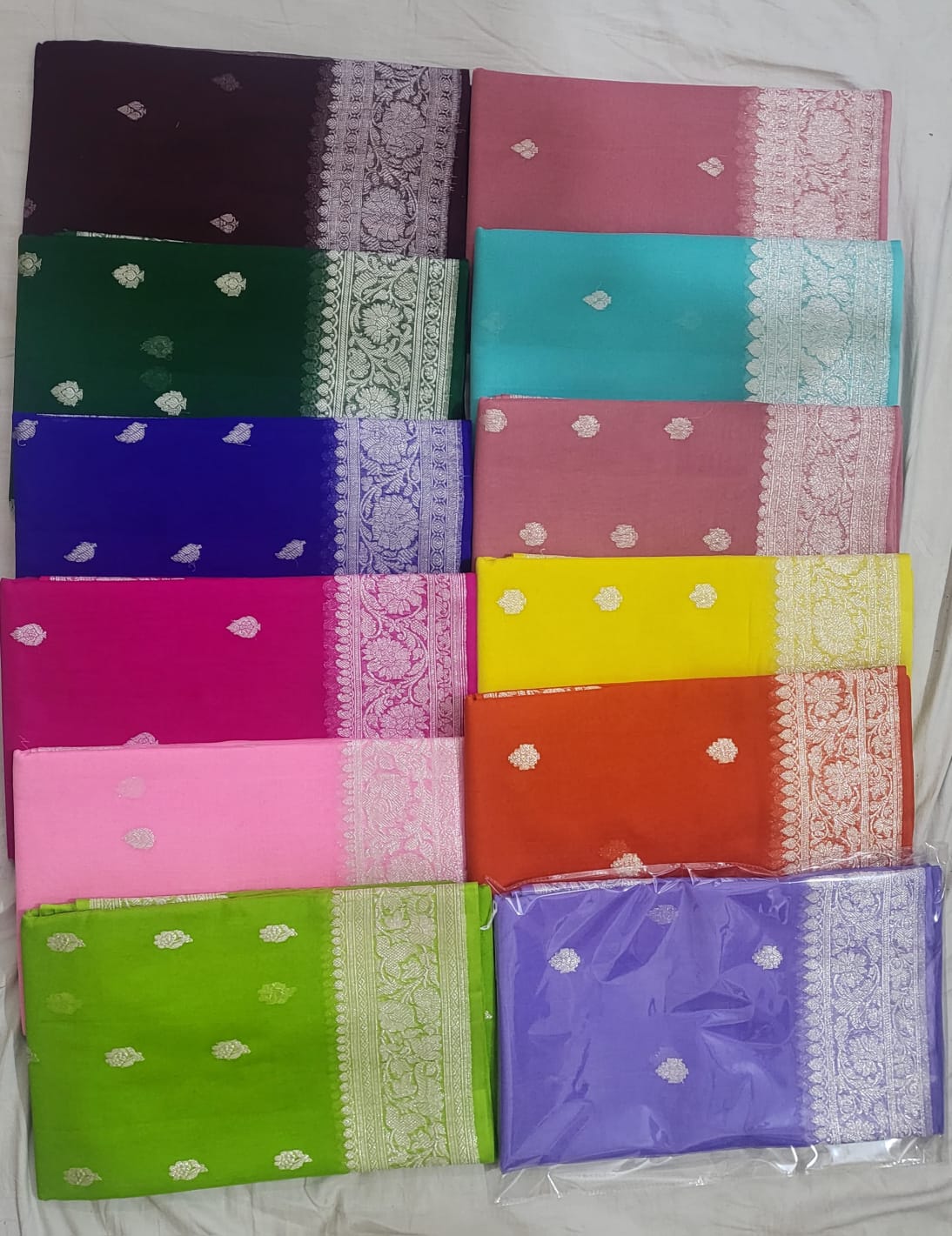 Handwoven in Banaras, these Pure Georgette Sarees are lightweight, elegant, and beautifully adorned with delicate silver zari motifs. Perfect for weddings, festive occasions, or timeless heirloom collections.