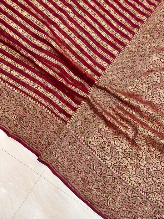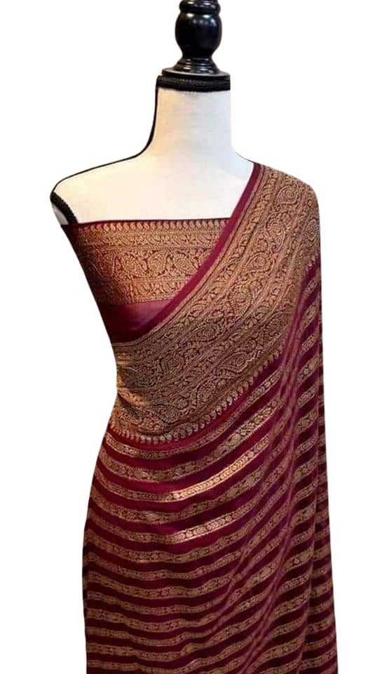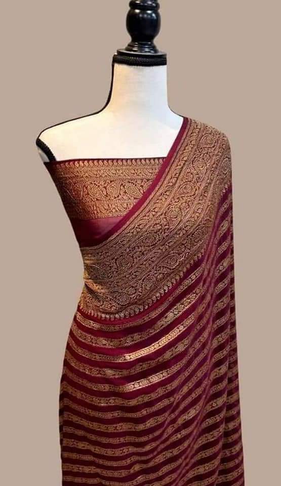 The Khaddi Georgette Silk Saree is a timeless handloom creation from Varanasi, woven with precision and passion by skilled artisans. Crafted in pure silk georgette, the fabric is known for its soft, flowy drape and subtle sheen, making it light yet luxurious.